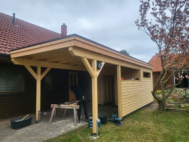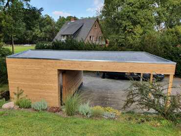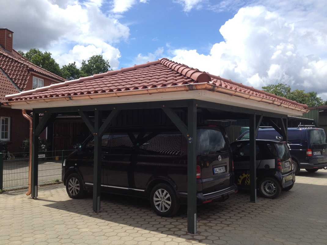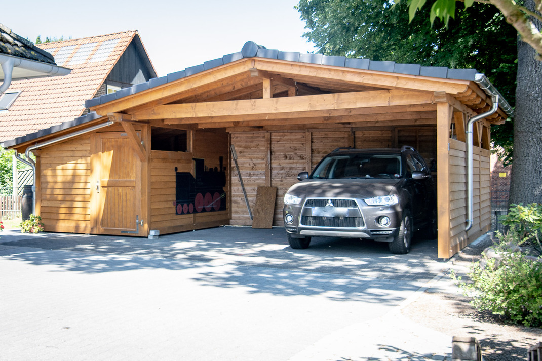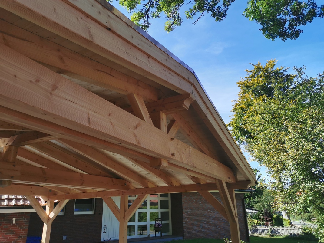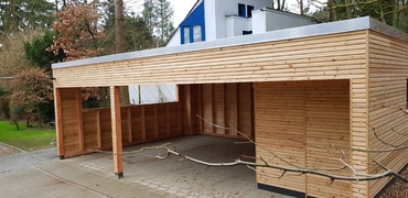 Der Vielfalt in Form und Farbe sind hier keine Grenzen gesetzt. Die baurechtliche Seite muß natürlich eingehalten werden. Über Grenzabstände, vorgeschriebene Höhen etc. werden Sie von uns genau informiert, schließlich übernehmen wir für sie auch den Bauantrag. Die Carports, ob Flachdach, Satteldach, oder Attika, werden von uns nach alter Zimmererkunst traditionell verzapft und abgebunden (zugeschnitten) und nach neuer Kunst am PC geplant, skizziert und auf Wunsch für sie auch visualisiert. Vorzugsweise wird getrocknetes, gehobeltes Fichten- oder Douglasienholz verwendet, so sind auch optimale Vorausetzungen für einen Lasuranstrich gegeben.
